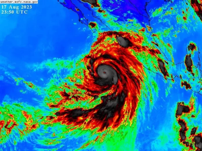 El meteoro presenta vientos máximos sostenidos de 195 kilómetros por hora y su centro de giro se localiza 715 kilómetros al sur de Cabo San Lucas, Baja California Sur.