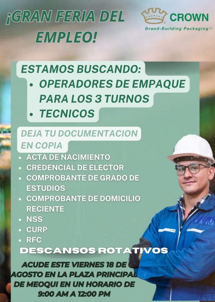En esta ocasión la empresa ofrece vacantes en puestos técnicos y para operadores de empaque en los tres turnos que maneja la vidriera, es por ello que el Gobierno Municipal de Meoqui a través de la dirección de Desarrollo Económico y Turismo hacen extensiva la invitación a la ciudadanía para que aproveche esta Feria de Empleo.