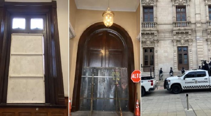 Previo a la llegada de los manifestantes acompañados de diputados de Morena desde la División del Norte, en Palacio de Gobierno fueron colocados refuerzos en las ventanas, mamparas así como personal de seguridad a fin de garantizar que no se registren mayores daños en el recinto.