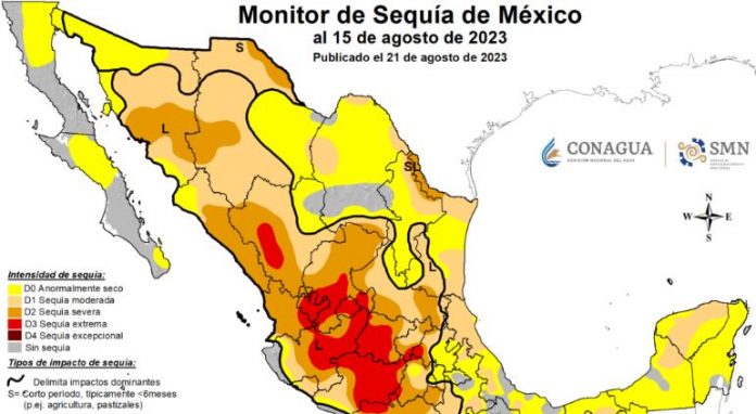 El último reporte del Monitor de Sequía de México indica que durante la primera quincena de agosto hubo afectación por sequía en el 55.78% del territorio nacional.