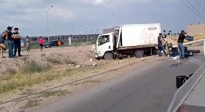 Delicias.- Un camión de carga se impactó contra un poste de concreto, lo derribo y finalmente volcó sobre las calles Moras y casi Plutarco Elías Calles en el municipio de Delicias, lo que dejó cuantiosos daños y una persona lesionada.