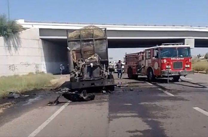 Delicias.- Rápidamente un tráiler se consumía al incendiarse por la parte frontal en el compartimiento del motor, su guiador logro descender para ponerse a salvo, los técnicos del fuego realizan los trabajos correspondientes.