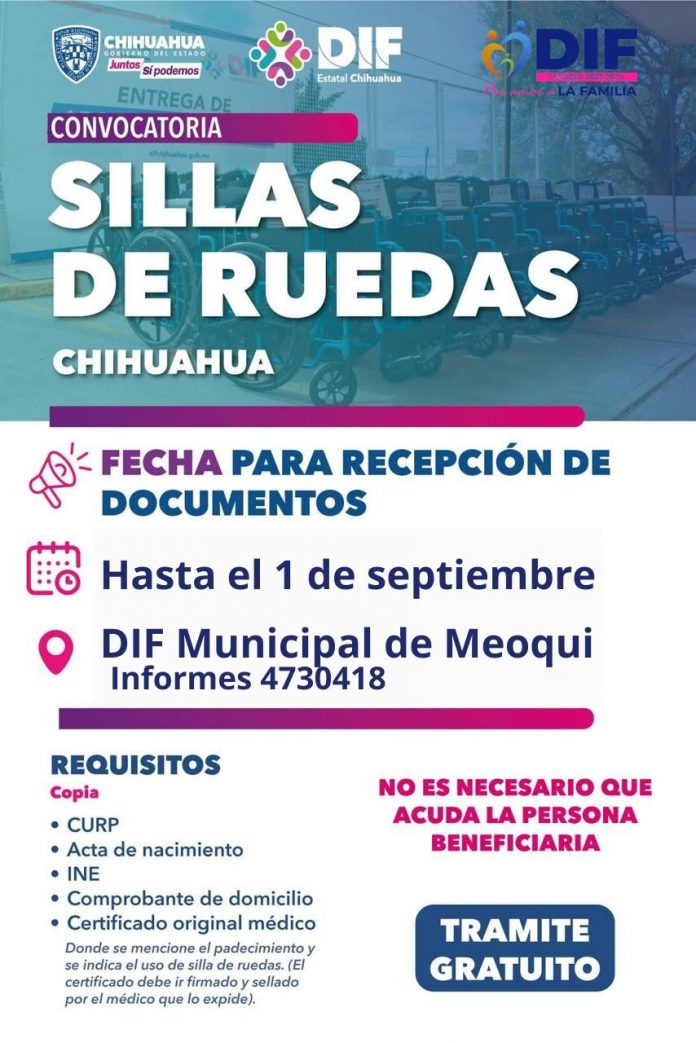 Meoqui.- Este viernes es el último día para registrarse al programa Emergente de Silla de Ruedas que lanzó Gobierno del Estado a través del DIF Estatal, es por ello que el Gobierno Municipal de Meoqui a través del DIF Municipal, hacen extensiva la invitación a la ciudadanía que requiera de estos aparatos funcionales, para que aprovechen este apoyo gratuito.