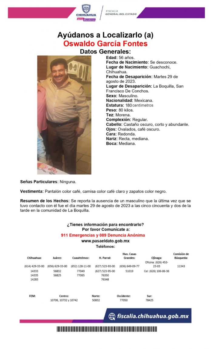 SFC.- La Unidad de Investigación de Personas Desaparecidas y Ausentes, de la Fiscalía de Distrito Zona Centro, en el municipio de Camargo, informa que desde la noche de ayer miércoles se realizan acciones de búsqueda para localizar al señor Oswaldo García Fontes.
