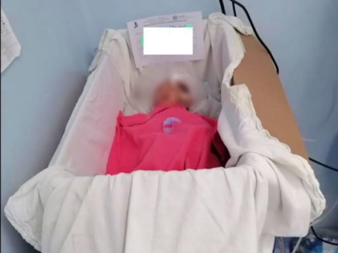 A través de redes sociales, una persona con acceso al área pediatría compartió la fotografía del neonato dentro de una caja cubierta con una sábana blanca, envuelto en una frazada color rojo, quedando en evidencia las carencias del centro médico más importante de la entidad.