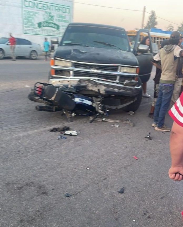 Meoqui.- Una persona dedicada al campo que viajaba en una motocicleta resultó lesionado tras participar en un choque con una pickup en el seccional de Lázaro Cárdenas.