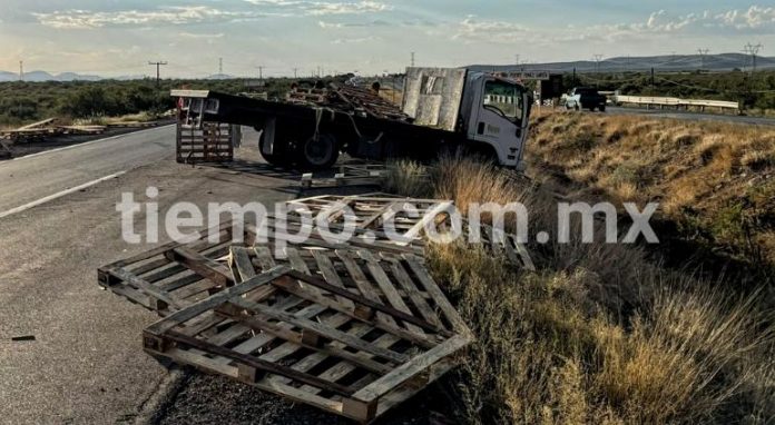 Delicias.- Un accidente dejó cuantiosos daños materiales en el kilómetro 195 de la carretera que conduce a Delicias, donde volcó un camión de carga y tiró diversas tarimas sobre la cinta asfáltica.