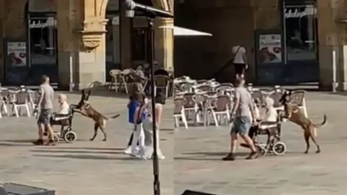 Se trata de un perro empujando con determinación la silla de ruedas de una anciana por los adoquines de la plaza.