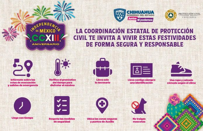 Chihuahua.- La Coordinación Estatal de Protección Civil (CEPC), emitió una serie de recomendaciones a la ciudadanía, para prevenir percances y disfrutar de las fiestas patrias de manera segura.