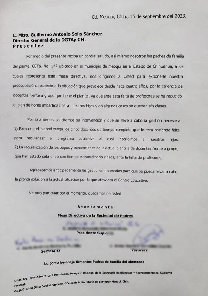 Representantes de la Mesa Directiva de la Sociedad de Padres del CBTA 147 de Meoqui solicitaron mediante un oficio la intervención y gestión necesaria del Mtro. Guillermo Antonio Solís Sánchez, director general de la DGTA y CM para que el plantel tenga los cinco docentes de tiempo completo faltantes, así como la regularización de pagos y percepciones a los maestros que han cubierto clases de manera extraordinaria.