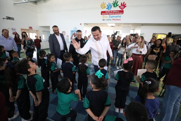 Ciudad Juárez.- Con la remodelación de la fachada principal, mejoramiento de aulas, áreas recreativas con juegos didácticos y otras adecuaciones, el Gobierno Municipal mejoró las instalaciones del Jardín de Niños y Estancia Infantil Eva Sámano de López Mateos.