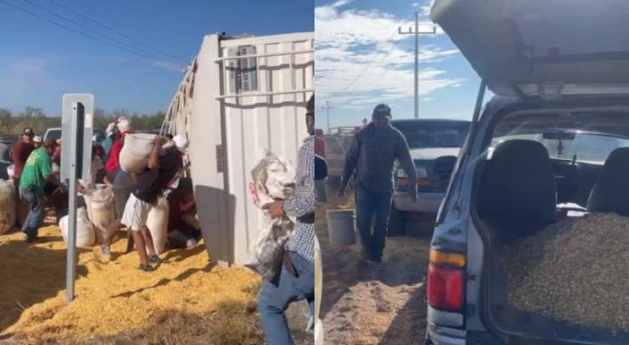 Jiménez.- En la carretera Jiménez – Parral se volcó un tráiler con maíz molido, por lo que la gente cercana al lugar comenzó a hacer rapiña, llevando varios costales y llenando las partes traseras de sus trocas y camionetas.