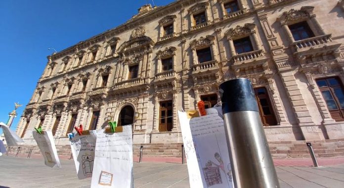Además de llevar a los niños a manifestarse en Palacio de Gobierno, acompañado de políticos del partido Morena, en las afueras colocaron un tendedero con escritos hechos por alumnos del profesor para pedir la entrega de libros de la SEP.