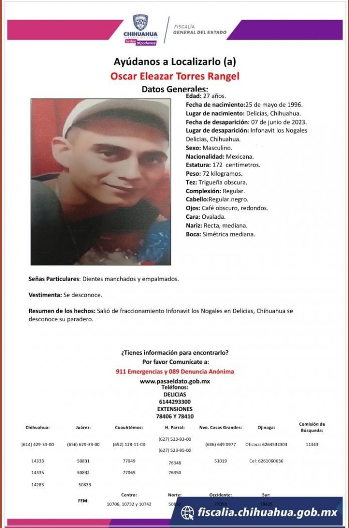 Delicias.- La Fiscalía y familiares solicitan ayuda para encontrar a Óscar Eleazar Torres Rangel de 27 años, quien desapareció el 7 de junio del presente año luego de salir de su casa en un fraccionamiento de Delicias.