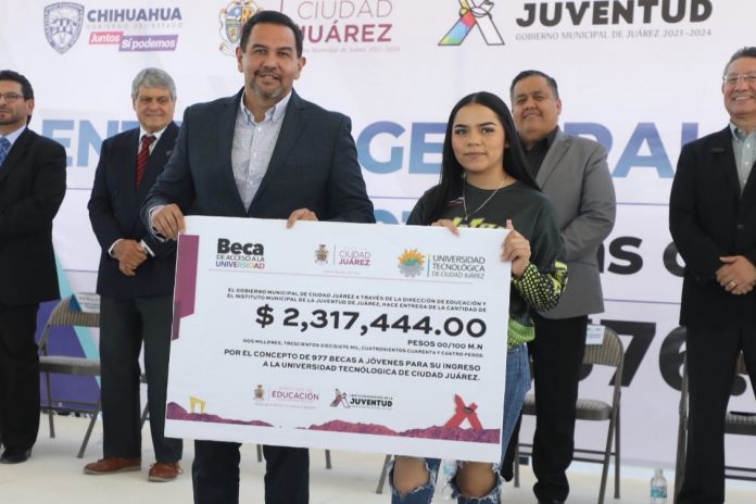 Ciudad Juárez.- Como parte de la estrategia para apoyar a los jóvenes que ingresan a la educación superior, el Presidente Municipal, Cruz Pérez Cuéllar, entregó hoy 977 becas de acceso a la universidad a estudiantes de la Universidad Tecnológica de Ciudad Juárez (UTCJ).