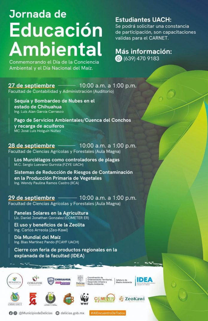 Delicias.- En conmemoración del Día de la Conciencia Ambiental y el Día Nacional del Maíz, se llevará a cabo una jornada de Educación Ambiental, del 27 al 29 de septiembre en las Facultades de Contaduría y Administración (FCA), y de Ciencias Agrícolas y Forestales (FCAyF) de la UACH.