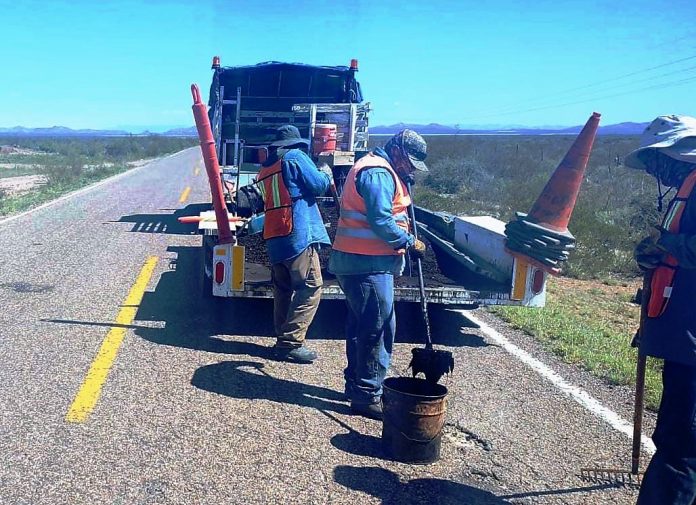 Chihuahua.- La Secretaría de Comunicaciones y Obras Públicas (SCOP) realizó trabajos de bacheo en la carretera Camargo-Ojinaga, concretamente en el tramo que va de la comunidad de La Perla a La Mula.