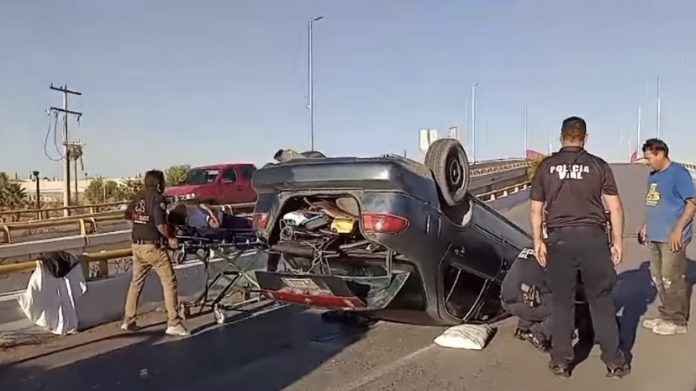 Esto, sucedió cuando las dos mujeres de entre 40 a 45 años se dirigían a uno de los centros médicos y al tratar de subir el puente de oriente a poniente perdieron el control e impactaron el muro de contención para terminar volcando, quedando llantas hacia arriba.