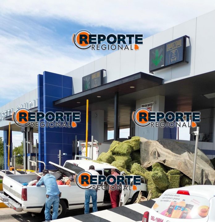 La camioneta Chevrolet de color rojo, que transportaba una considerable carga de pacas de alfalfa, perdió parte de su carga en la parte trasera del vehículo. Las pacas de alfalfa se desprendieron y quedaron regadas en la caseta de peaje.