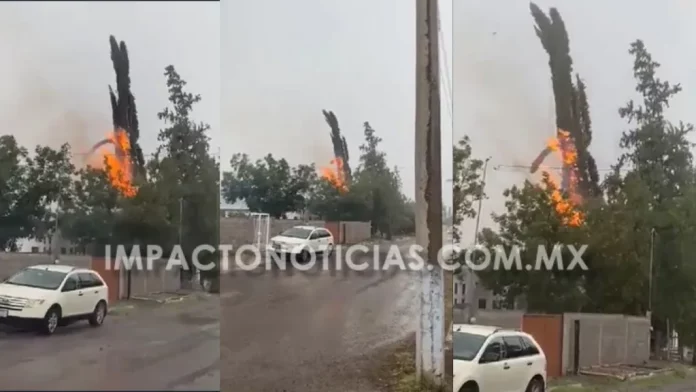 Camargo.- Se compartió con este medio de comunicación el momento en que un pino se incendia luego de recibir el impacto de un rayo sobre este.