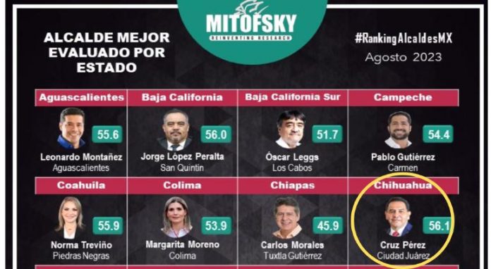 Ciudad Juárez.- Cruz Pérez Cuellar presidente municipal de Ciudad Juárez se ubicó como el alcalde mejor evaluado en el estado, en una encuesta realizada en el mes de agosto por Mitofsky,