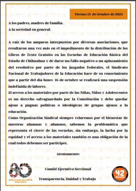 Chihuahua.- La Sección 42 del Sindicato Nacional de Trabajadores de la Educación (SNTE) en Chihuahua ha emitido un comunicado dirigido a los padres de familia y a la sociedad en general, informando sobre la suspensión indefinida de labores que iniciará a partir del lunes 16 de octubre.