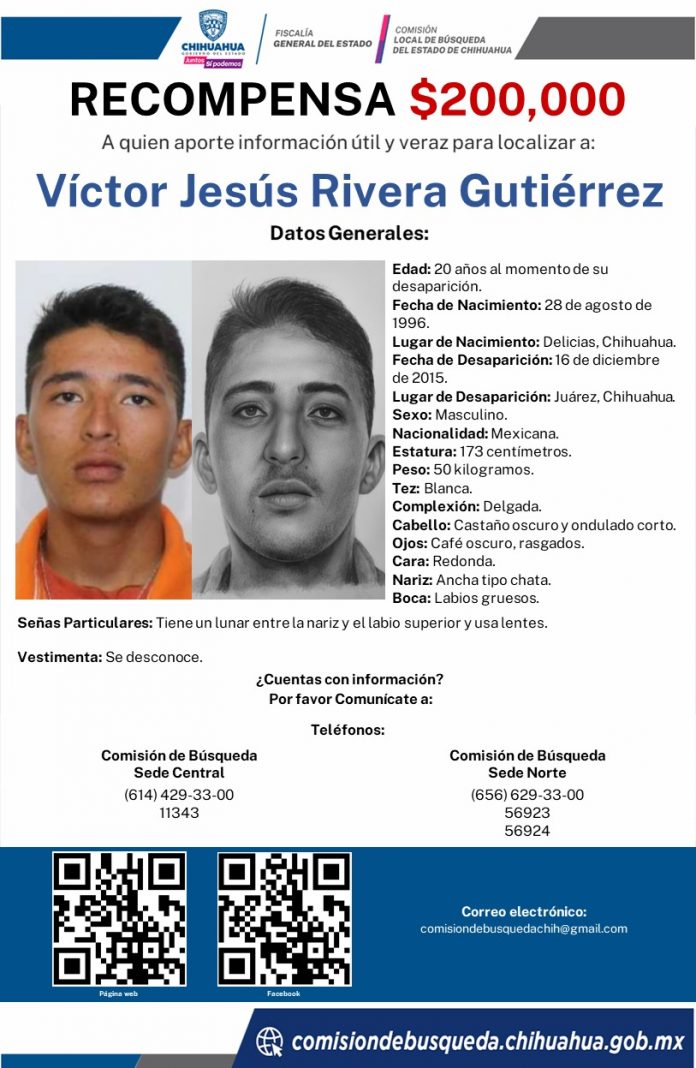 Delicias.- Recompensa de $200,000 pesos quien aporte información útil y veraz para localizar a: Víctor Jesús Rivera Gutiérrez, deliciense desaparecido en Juárez