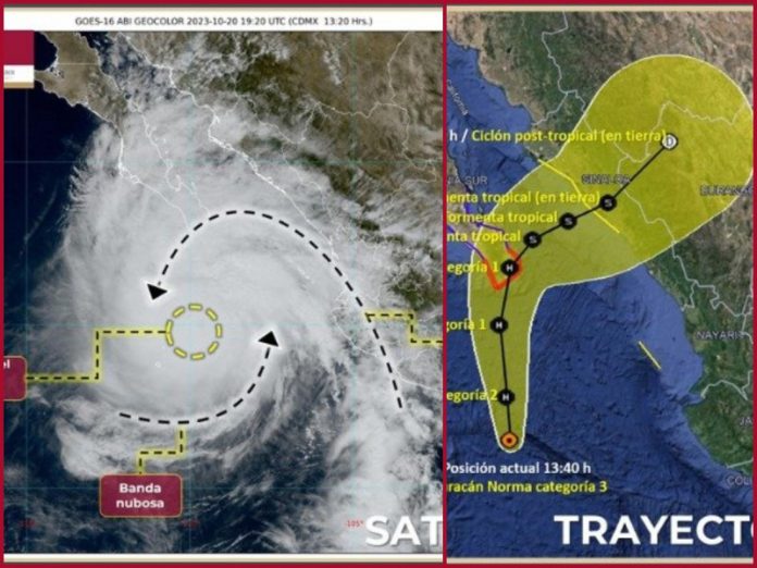 Las bandas nubosas de Norma provocarán lluvias puntuales torrenciales en Baja California Sur, lluvias puntuales intensas en Sinaloa y Nayarit, muy fuertes en Jalisco, Colima y Michoacán, además de fuertes en Durango, alertó la Comisión Nacional del Agua en su último reporte.