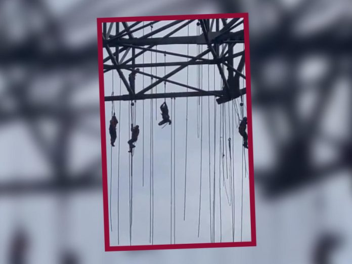 Trabajadores quedan colgados en lo alto de una construcción; hay un muerto