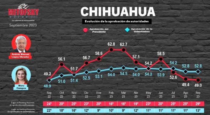 Chihuahua.- Consulta Mitofsky difundió el ranking de aprobación del presidente Andrés Manuel López Obrador y la gobernadora Maru Campos Galván en el estado de Chihuahua, actualizado al mes de septiembre.