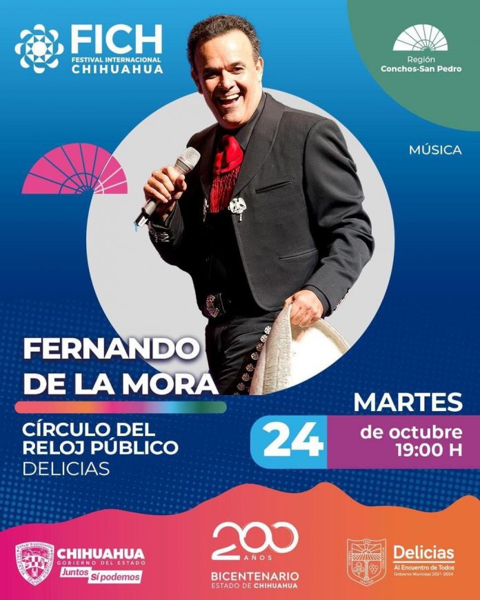 Delicias.- Como parte de las actividades del Festival Internacional de Chihuahua (FICH), Presidencia Delicias extiende la invitación al concierto estelar del tenor Fernando de la Mora, este martes 24 de octubre en el círculo el Reloj Público, en punto de las 6 de la tarde, donde se contará también con la participación de la Banda Sinfónica de la 11 Región Militar.