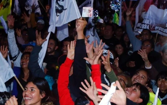 Supuestos trabajadores de la administración de la Alcaldía aventaron desde monedas hasta billetes de 100 a los asistentes, mientras coreaban porras de apoyo al alcalde.
