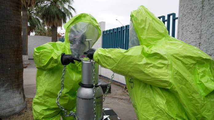 Durante el ejercicio, el personal de la JMAS demostró su capacidad para manejar eficazmente una situación de fuga de material en el proceso de cloración urbana, utilizando los procedimientos establecidos que procuran la seguridad de los trabajadores y la comunidad en general.