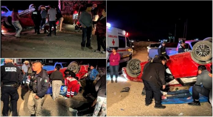 Tripulaban un auto Chevrolet de color rojo, cuando el conductor perdió el control del volante y termino por volcarse para quedar en el terreno a un lado de la carretera.
