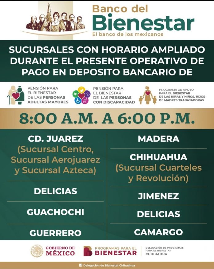Por su parte, la coordinadora para la construcción de Bancos de Bienestar en el estado de Chihuahua, Fátima Guzmán Gallardo, informó que el resto de las sucursales estarán laborando en su horario habitual que es de 9:00 de la mañana a 4:30 de la tarde.