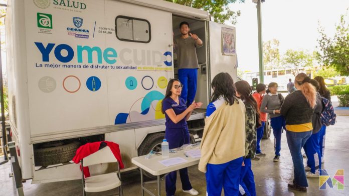 Meoqui.- Con el objetivo de fortalecer y consolidar la cultura de la salud reproductiva, en Meoqui se está llevando la Unidad Móvil Edusex a escuelas preparatorias, donde personal de salud de la Jurisdicción Sanitaria, Gobierno del Estado y Gobierno Municipal a través de Salud Municipal, brindan información en este tema, detecciones, pláticas y colocan métodos anticonceptivos.