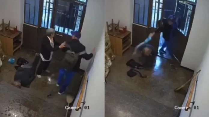 En el video se ve como un hombre comienza a golpear a una mujer mayor mientras entra en una casa, una joven y otra señora tratan de detenerlo pero él sigue golpeando a la primera mujer.