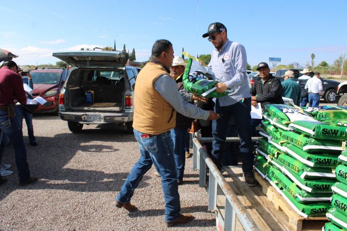 Delicias.- Como parte del programa de atención a la sequía del Gobierno del Estado, la Secretaría de Desarrollo Rural (SDR) encabezó, en conjunto con los ayuntamientos de Delicias, Meoqui, Rosales, Saucillo y la Cruz, entregó 1,200 sacos de semilla de alfalfa subsidiada en beneficio de más de 150 productores de municipios de la región centro-sur.