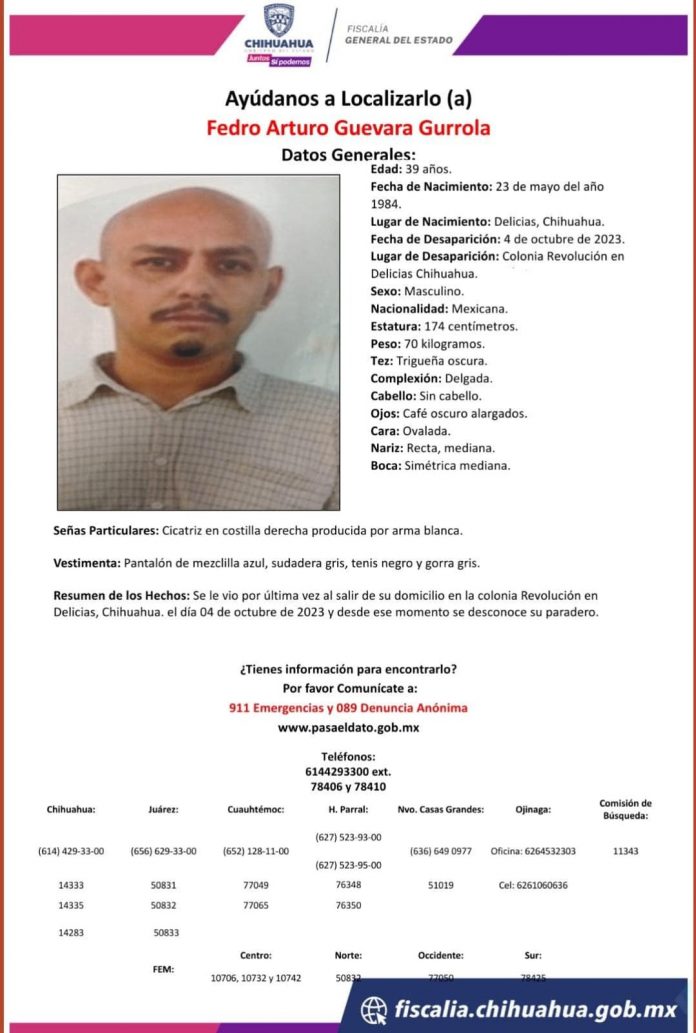 Fedro Arturo Guevara Gurrola de 39 años desapareció hace más de un mes luego de que saliera de su casa en la colonia Revolución en Delicias. Su familia desconoce dónde puede encontrarse por lo que le piden ayuda a la ciudadanía para localizarlo.