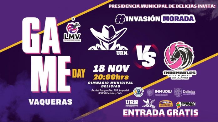 Delicias.- En abono a la estrategia del fomento al deporte y de la generación de derrama económica a partir del turismo deportivo, se llevará a cabo este sábado 18 de noviembre el encuentro entre Vaqueras de la URN contra INDOMABLES de Cd. Juárez como parte de la Liga Mexicana de Volibol del cual Delicias, será sede.