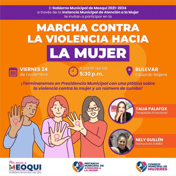 Meoqui.- En el marco del Día Internacional de la Eliminación de la Violencia contra la Mujer, este viernes el Gobierno Municipal de Meoqui a través de la Instancia Municipal de Atención a la Mujer llevará a cabo la Marcha Silenciosa que iniciará a las 5:30 de la tarde desde el Bulevar Eduardo Nájera, para culminar en explanada de Presidencia Municipal, donde continuará el evento con una plática a cargo de la Terapeuta Talia Palafox.