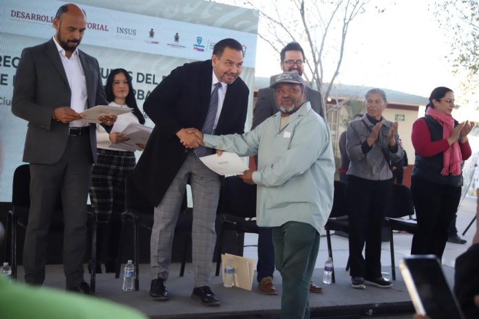 La ceremonia de entrega de los documentos la presidieron el alcalde Cruz Pérez Cuellar; José Alfonso Iracheta Carroll, director general de INSUS; Mónica Palacio García, representante regional de INSUS en el estado de Chihuahua y Julio de la Cruz Reyes, director de Asentamientos Humanos.