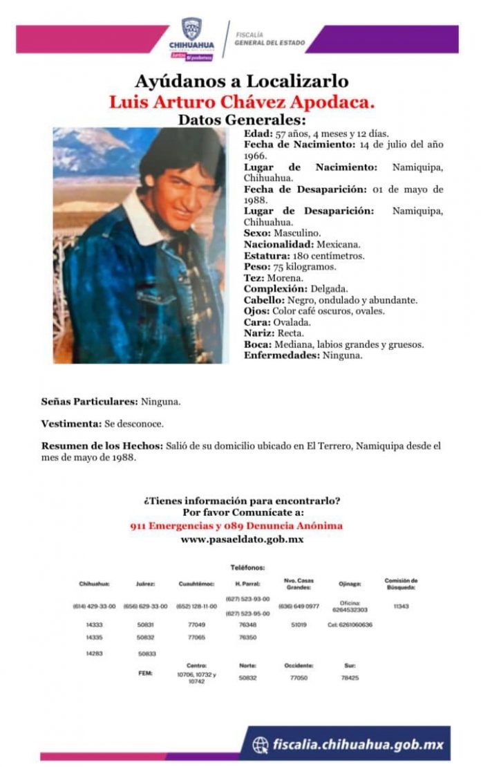 Chihuahua.- La Fiscalía y familiares solicitan ayuda para encontrar a Luis Arturo Chávez Apodaca, quien desapareció hace 35 años tras salir de su casa en Namiquipa. Sus familiares no pierden la esperanza de volverlo a ver.