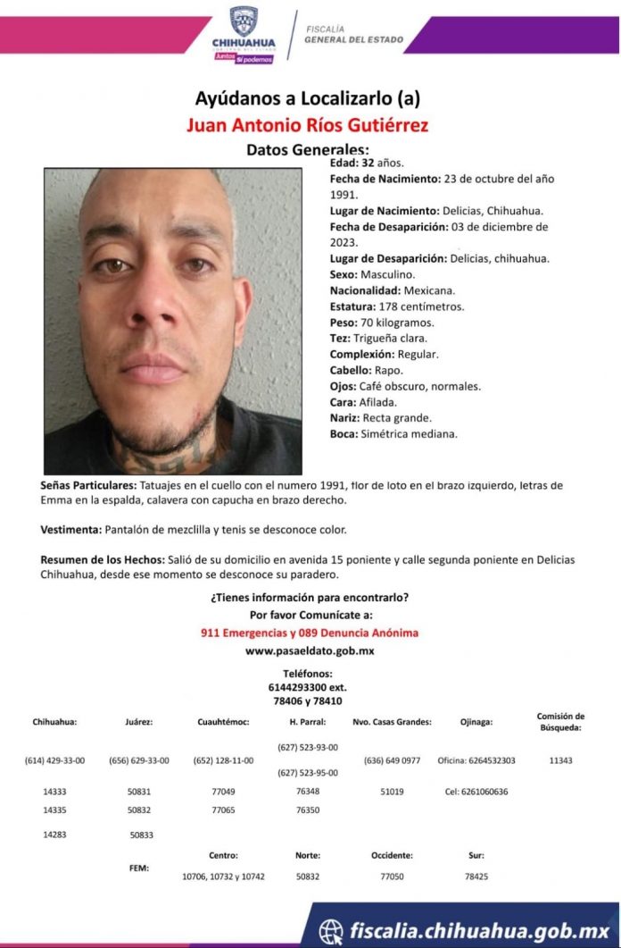 Delicias.- La FGE lanzó un comunicado con tal de dar con el paradero de Juan Antonio Ríos Gutiérrez, desaparecido el pasado 3 de diciembre en Delicias.