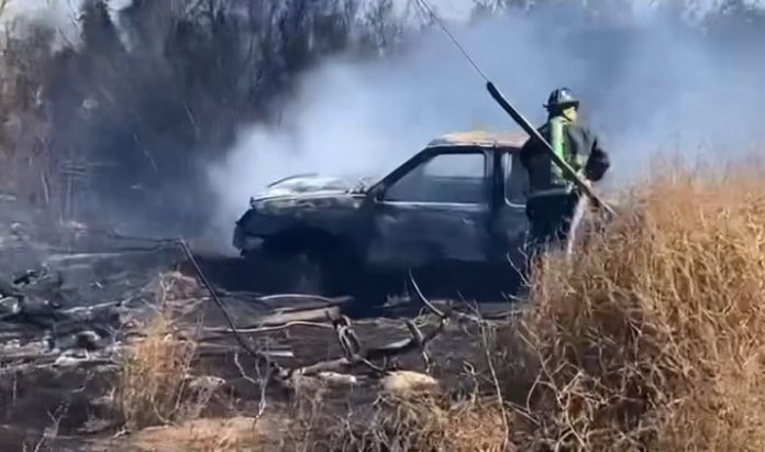 Meoqui.- Una camioneta se incendió por completo generando daños materiales totales, esto, en la carretera federal 45, tramo Meoqui – Lázaro Cárdenas.