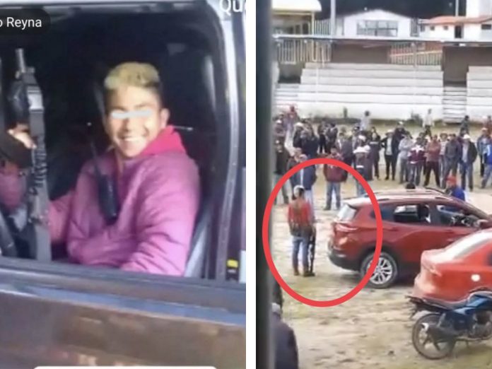 En las imágenes se puede ver cómo pobladores armados con machetes y palos lo rodean, él lleva un arma larga en la mano.