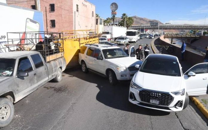 Mismos que quedaron atravesados sobre el canal generando caos vial junto con un vehículo Ford, Explorer; un March; un Nissan, Sentra de modelo atrasado; un Volkswagen y un camión de carga.