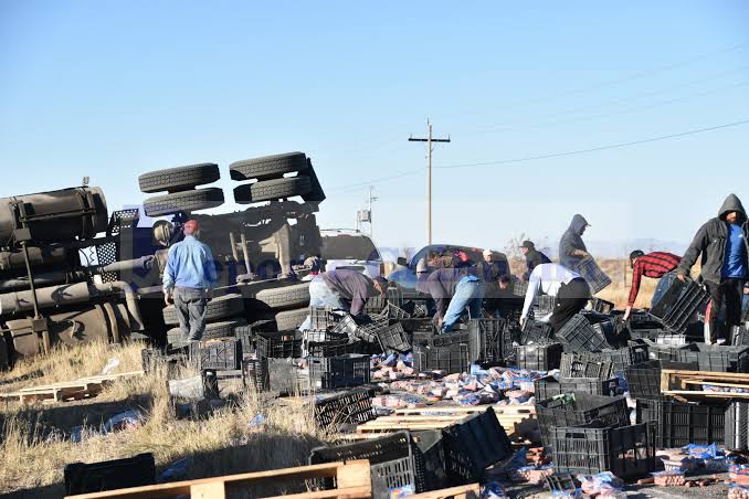 Ciudad Juárez.- El conductor de una pick up se incorportó a la carretera a Juárez sin fijarse que venía un tráiler, ambos chocaron y terminaron por volcarse a un lado de la carretera, dos personas resultaron con lesiones de gravedad mientras que que varias personas rapiñaron carnes frías que quedaron regados en la zona.