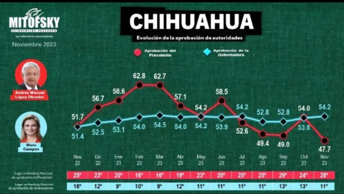 Chihuahua.- Ahora compartió Mitofsky la encuesta al corte del mes de noviembre de la aprobación de la Gobernadora del Estado y el Presidente de México en Chihuahua.