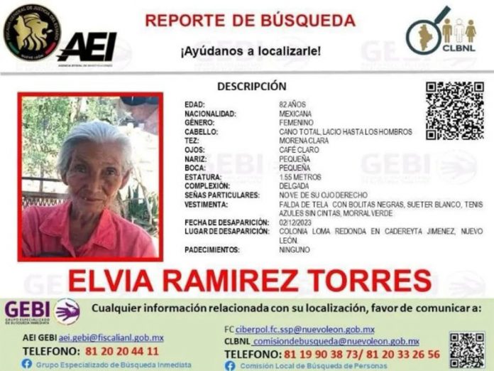 Nuevo León.- Una mujer de la tercera edad identificada como Elvia Ramírez Torres, que había desaparecido a inicios de este mes de diciembre en el municipio de Cadereyta Jiménez, Nuevo León, fue encontrada muerta el pasado fin de semana.